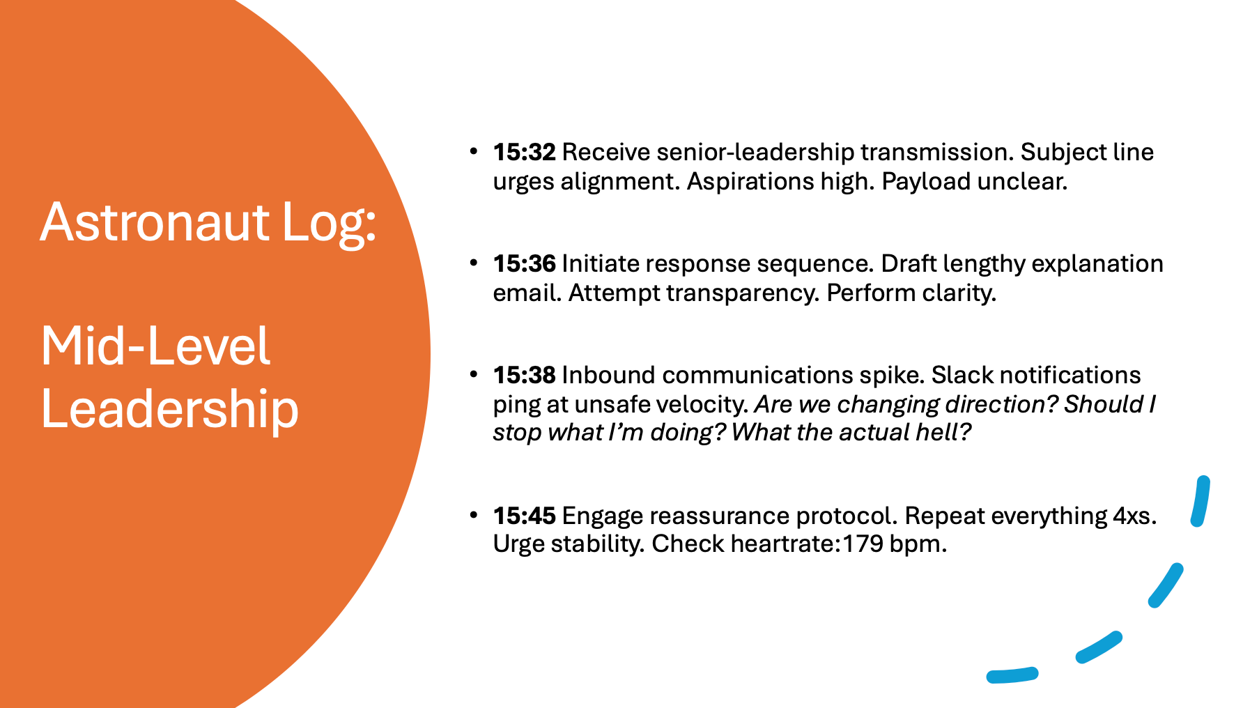 If you’re going to improve your internal comms as a mid-level leader, you’re probably going to need to stop saying, “How can I craft another message to my team?” and start asking, “What do I keep doing, every time one of these confusing senior-level communications happen—and is that thing I keep doing working?”